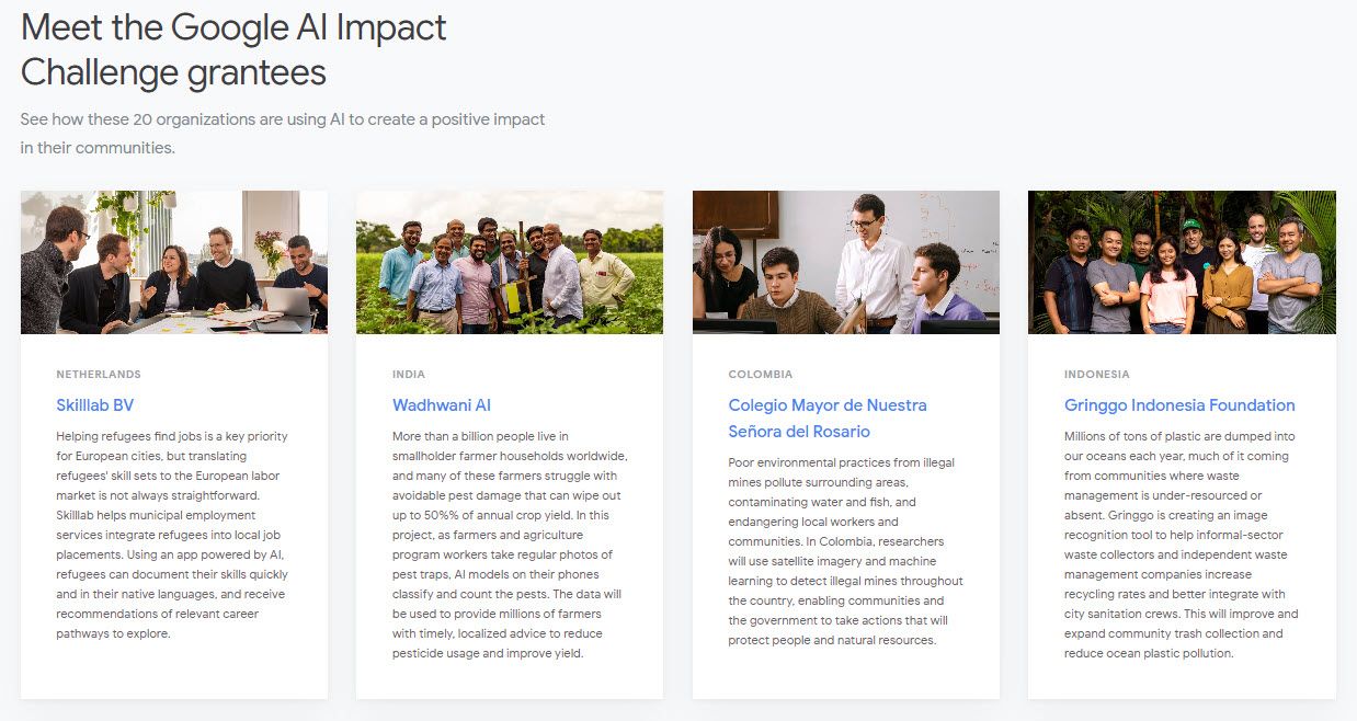 Google è in prima linea negli sviluppi dell'IA. Vuole anche promuoverlo attraverso cause locali e globali. Il Google.org Impact Challenge vuole affrontare molti problemi sociali e ambientali utilizzando l'intelligenza artificiale come aiuto.
