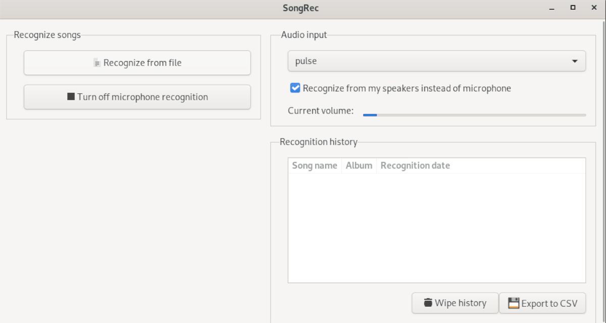 Passaggio 3: trova il pulsante “Attiva riconoscimento microfono” all’interno di SongRec. Cliccaci sopra. Quando selezioni questo pulsante, l’app SongRec inizierà il riconoscimento del brano. Noterai che il riconoscimento dei brani funziona quando il misuratore del volume nell’app è in movimento.